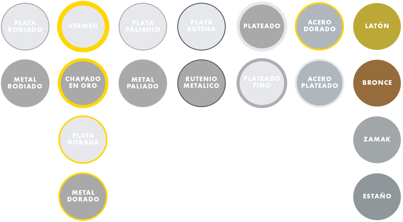 Aleación de oro de 9 a 18 quilates (375 a 750/000) según las normas internacionales. El resto de la aleación es plata y cobre.